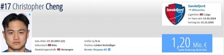 直播吧09月19日讯 德转更新了挪威联赛的身价配资安全指数网,华裔边后卫郑泽彦身价继续上涨至120万欧。